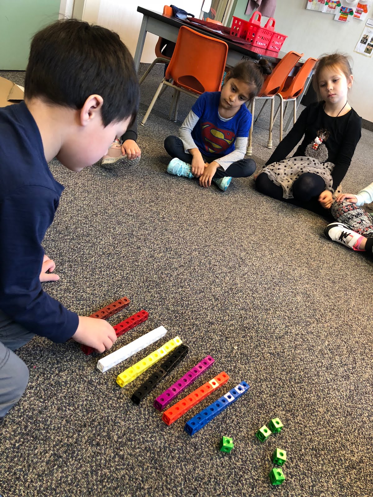 Students are exploring counting by 10's and 1's. We used snap cubes to make groups of 10 and counted by 1's for the left overs.